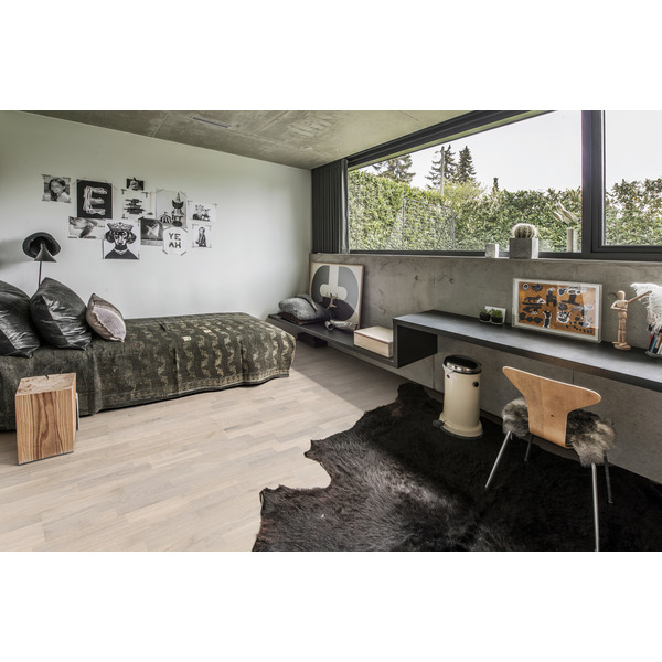 Eik Rime et 3-stavs parkettgulv, børstet, med ultramatt lakk, som ser og føles som nysaget tre. Hvit..