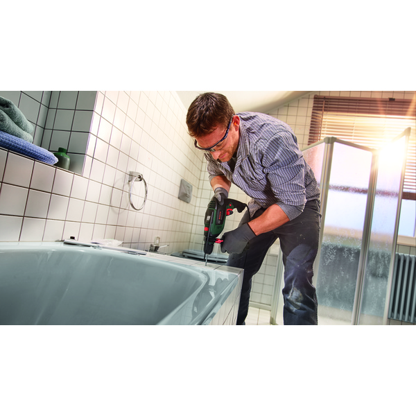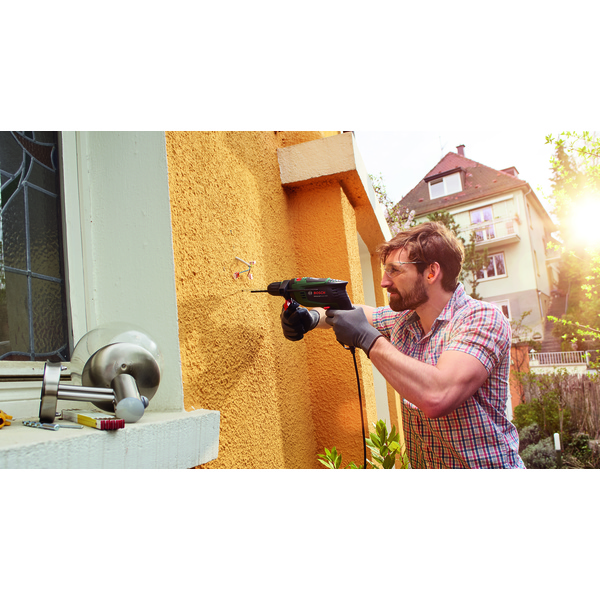 UniversalImpact 800 er perfekt for raskt og sikkert arbeid under større prosjekter. Den har KickBack Control som sørger for at verktøyet stopper helt ved blokkering av boret, en Autolock-chuck som sørger for raskt bytte av bor med én hånd, og Bosch Speed Preselection som sørger for nøyaktig innstilling av borehastigheten og gir riktig hastighet for det aktuelle materialet. I tillegg vil Constant Speed-funksjonen justere hastigheten automatisk for jevn boring uansett belastning. Den kraftig 800 W motor sørger for at arbeidet går raskt i både mur, tre, myk betong og metall og gir mulighet til boredybde på inntil 14 mm i mur og inntil 30 mm i tre.