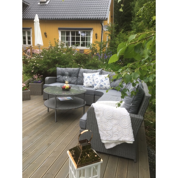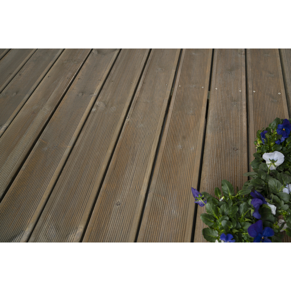 Alvdal Royal behandlet terrasse er vedlikeholds vennlig, relativt formstabil og har lang levetid. Behandlingen er en 2 trinns prosess hvor materialene først impregneres (kl AB) for deretter å kokes i royal olje. Dette gir et UV beskyttet produkt med transparent farge, nyanser skapes avhengig at trestruktur. Vi anbefaler syrefaste festemidler samt at alle snittflater etterbehandles med Alvdal Royal olje.