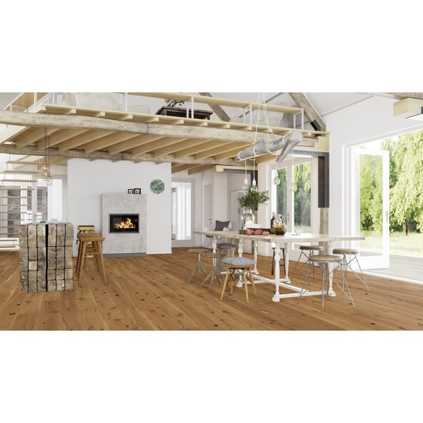 Eik Espressivo 138 mm plank er et nydelig, rustikt gulv med naturlig eikefarge. Røff sortering med stort fargespill, sparklede kvist og sprekker, samt yteved. Parketten er børstet og behandlet med naturolje. Børsting og naturolje fremhever overflaten og trestrukturen og gjør gulvet godt og behagelig å gå på. Parketten har et røft fargespill, store sparklede kvist og sprekker. For å forbedre slitestyrken anbefaler vi ett strøk med Boen Natural Oil før gulvet tas i bruk, deretter Boen Freshen Up for vedlikehold av mer trafikkerte områder. Ekte tre er et fornybart og levende materiale som gir en rekke helsefordeler med på kjøpet. Limfritt, rask og sikker legging med 5G Click system. Velegnet for gulvvarme.