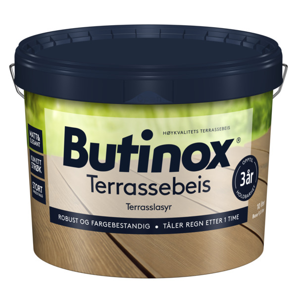 Butinox Terrassebeis fremhever og bevarer treverkets naturlige struktur med et transparent klart eller innfarget utseende. Butinox Terrassebeis er robust og fargebestandig med opptil 3 års holdbarhet.
