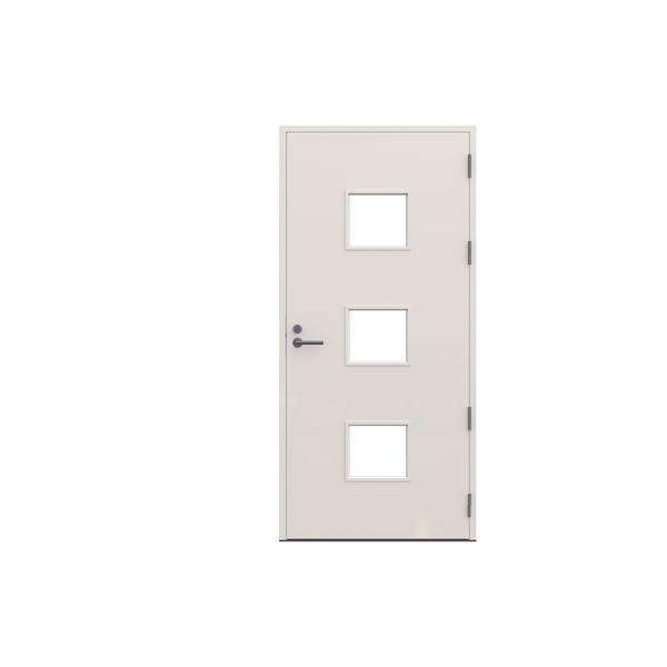 Ytterdør med tre glass. Slett overflate. 115mm karm i samme farge som dørbladet. 8765 låskasse. 1296 sylinder