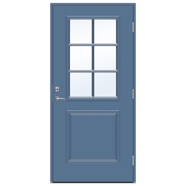 Swedoor Smetana ytterdørsett 10×21 Høyre malt blå NCS S5020-R90B med klart glass. Dette er en ytterdør i vår ADVANCE-LINE Classic serie inspirert av klassisk arkitektur fra tidlig 1900-tall. Det historiske uttrykket er kombinert med en moderne konstruksjon som har solide glasslister uten skjøter og spiker, noe som understreker dørens vakre utseende og gir økt sikkerhet mot innbruddsforsøk.