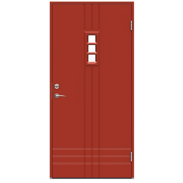 Swedoor Bengal ytterdørsett 9×21 Venstre malt mørk rød NCS S4050-Y80R med klart glass. Dette er en ytterdør i vår ADVANCE-LINE Function serie. Kombinasjonen av funkisinspirert design med en solid konstruksjon gir en dør som er både stilren og har god sikkerhet mot innbrudd. Dører med glass har glasslist helt fri for skjøter og spiker.