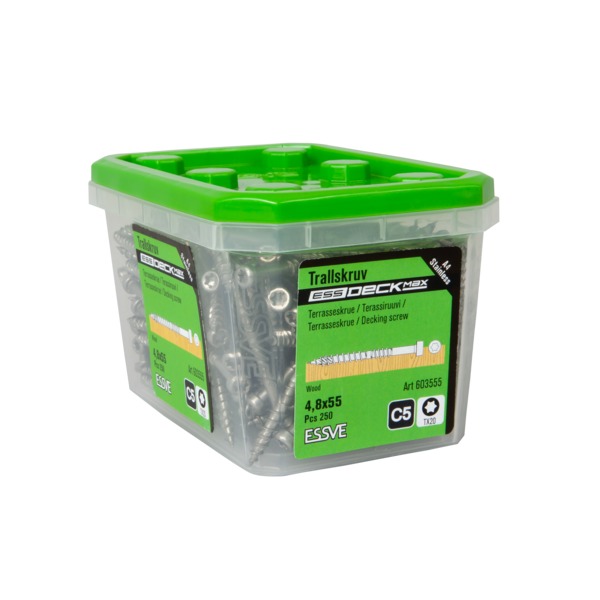 ESSVE Terrasseskrue ESSDECK MAX er den beste skruen for toppskrudd montering. Lite hode gir pent resultat uten sprekker og fliser. Høy klemkraft forenkler montering ved kuvede terrassebord. Samme stålkvalitet som i våre konstruksjonsskruer. CE-merket. Syrefast A4 brukes i kystnære og aggressive miljøer, eller til eksklusive tresorter. For lengst levetid anbefales syrefaste terrasseskruer.