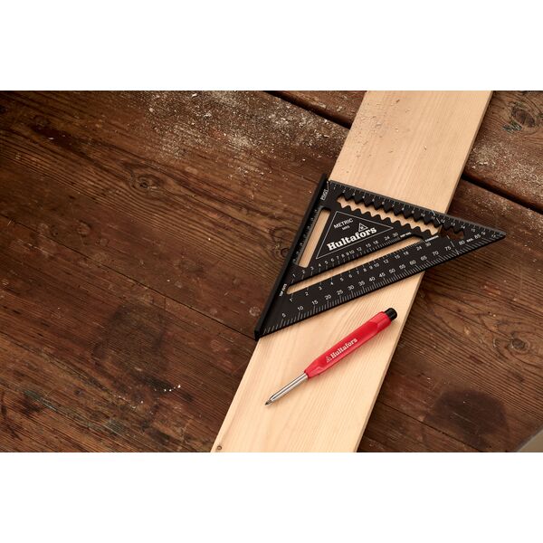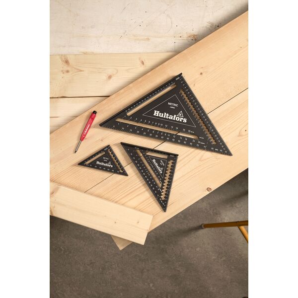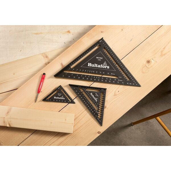 Gradvinkelen er et robust og allsidig verktøy for alle håndverkere. Verktøyet gjør det mulig å foreta raske og presise avmerkinger av 45° og 90°. Den kan også brukes som en vinkelmåler, for enkel måling og merking av andre vinkler. Den tykke kanten er i tillegg nyttig som guide ved saging, for kapping på 45° og 90 °, og for å finne og merke ulike vinkler. Dette svært allsidige verktøyet kan også brukes til å lage blyantstreker eller kutte gipsplater med kniv. Og selvfølgelig har den mellomstore og store versjonen skalaer for kutting av bjelker til valmtak og skiftesperrer.