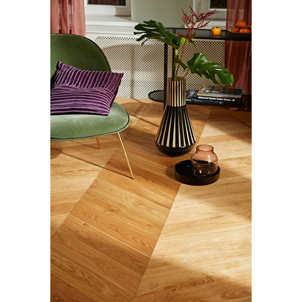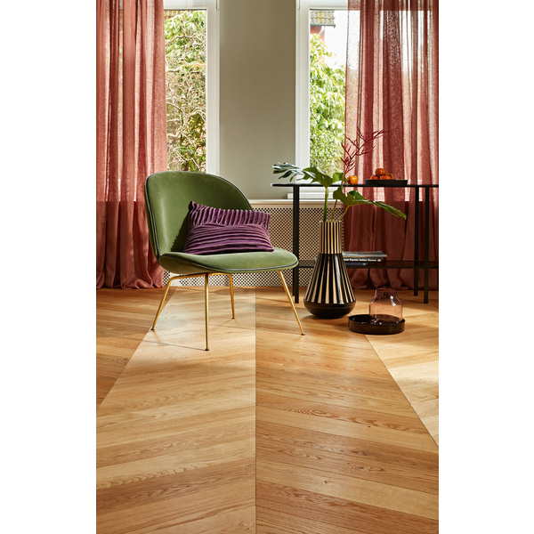Eik Adagio børstet 138mm Chevron har en naturlig varm eikefarge. En moderne vri på et tradisjonelt mønstre: Chevron er et omvendt V-mønster som gir et stilig og moderne utseende. Jevne fargeoverganger og et rolig fargespill, kvist forekommer. Parketten er børstet og behandlet med naturolje. Børsting og naturolje fremhever overflaten og trestrukturen og gjør gulvet godt og behagelig å gå på. For å forbedre slitestyrken anbefaler vi ett strøk med Boen Natural Oil før gulvet tas i bruk, deretter Boen Freshen Up for vedlikehold av mer trafikkerte områder. Husk matchende gulvlister for å skape helhet og et eksklusivt utseende. Velegnet for gulvvarme og nordisk klima. Dette gulvet har en not/fjærforbindelse og må hellimes til undergulvet. Det må kombineres med Chevron B-stav (56478694)