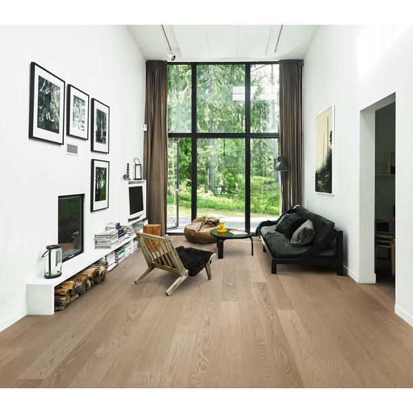 De grå tonene i dette 1-stavs gulvet fra Capital Collection er balansert med en jevn fargevariasjon mellom plankene. Bare eiketømmer av fineste kvalitet er brukt, og hvert bord er børstet for å få frem særtrekkene i sorteringen og fremheve den naturlige teksturen av treet. Den lysabsorberende, ultramatte lakken skaper inntrykk av nysaget tømmer, som effektivt eliminerer skinn i overflaten, samtidig som det beskytter treet mot daglig slitasje. Mikrofasede kanter på fire sider forsterker et klassisk, plankeutseende.