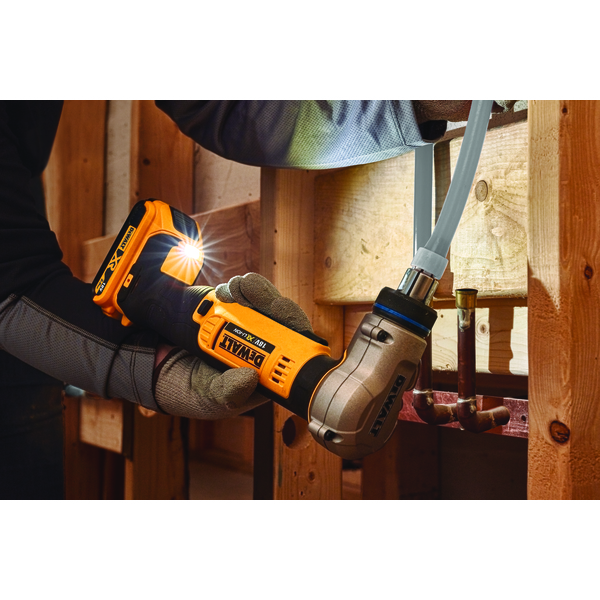 Foreta raske ekspansjoner for PEX type-A rør med 18V XR PEX ekspansjonsverktøy. Et automatisk roterende hode hjelper deg å sikre jevn ekspansjon. Kraftige LED-lys skrus på automatisk ved full aktivering. Ink. hengekrok og beltekrok. Verktøyet er utstyrt med 16 mm, 20 mm og 25 mm DEWALT PEX ekspanderende hoder. 32 mm ekspanderende hode er tilgjengelig som tilbehør. Leveres med