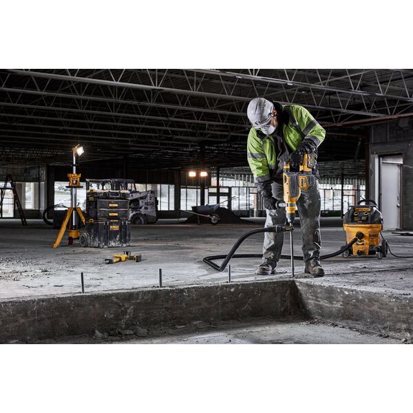 DEWALT Borhammer SDS-Max 54V 9.0Ah med børsteløs motor gir økt holdbarhet, effektivitet og kraftlevering 13,3 J slagkraft. Borhammeren er ideell for tunge og krevende bruksområder og har Anti-Vibration Control (AVC) som gir 9m / s2 ved boring i betong og 8,8m / s2 under meisling. Dette reduserer utmattelse og øker sikkerhet, komfort og produktivitet. Den vier 8kg med et optimalisert tyngdepunkt som gir utmerket ergonomi. Med en elektronisk og integrert mekanisk clutch sørger borhammeren for utmerket beskyttelse og kontroll. Den har også trådløs verktøykontroll som gir automatisk tilkobling til støvsugeren DCV586. Borhammeren leveres med lader og 2x 9.0Ah batterier.