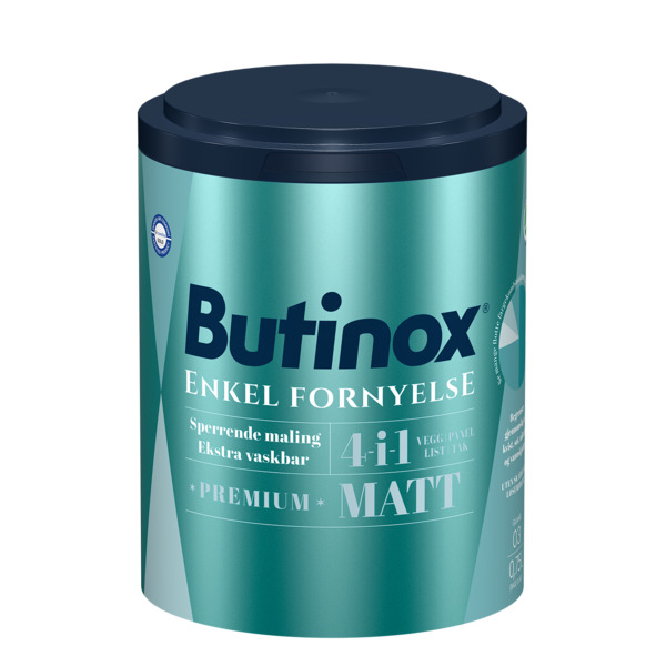 Butinox Premium Matt A-base 0,68L er en matt maling med lav sideglans som gir en flott delikat overflate. Malingen er en effektiv kombinasjonsmaling som passer til alle rom med unike påføringsegenskaper og kan brukes på vegg, panel, list og tak. I tillegg har malingen sperrende egenskaper mot vann-, sot- og nikotinskader samt at den begrenser for gjennomslag fra kvister. Løsemiddelfri og luktsvak.