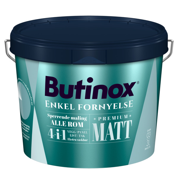 Butinox Premium Matt B-base 2,7L er en matt maling med lav glans som gir en flott delikat overflate. Malingen er en effektiv kombinasjonsmaling som passer til alle rom med unike påføringsegenskaper og kan brukes på vegg, panel, list og tak. I tillegg har malingen sperrende egenskaper mot vann-, sot- og nikotinskader samt at den begrenser for gjennomslag fra kvister. Løsemiddelfri og luktsvak.