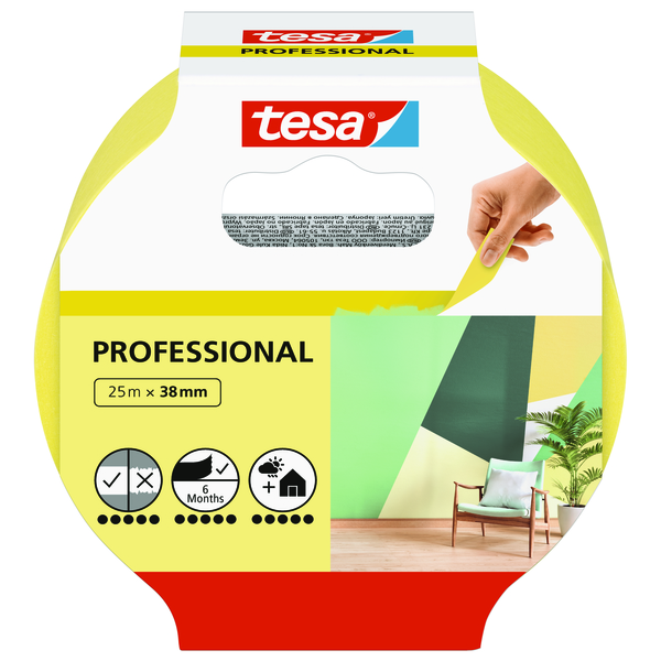 tesa Maskeringstape Professional sikrer knivskarpe og rette malingskanter i ethvert maleprosjekt, takket være det originale washipapiret. Tapen gir nøyaktighet, den er lett å påføre og den kleber godt til en lang rekke overflater – klar til ethvert malearbeid, selv når den brukes i hjørner og kanter. På grunn av de utmerkede klebeegenskapene kan tesa Maskeringstape Professional enkelt fjernes, og etterlater ingen spor. Tapen gir restfri fjerning i opptil 6 måneder når den brukes innendørs, og i opptil 2 måneder utendørs. Den ekstra rivefastheten, samt evnen til å bli fjernet uten å gjøre skade på underlaget, gjør den til den perfekte løsningen ved krevende malearbeid.