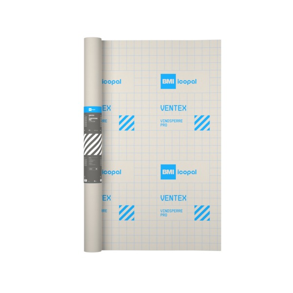 Ventex Vindsperre Pro er tykkere og bedre vindsperre enn forgjengeren Windbreak, som Icopal har videreutviklet gjennom mer enn 30 år. Dette er en svært diffusjonsåpen vindsperre, som sikrer at byggfukt tørkes raskt ut, og at eventuell fuktig luft fra innemiljøet slipper ut. Ventex Vindsperre Pro er ideell til tetting av råbygget. Den gylne fargetonen bidrar til at produktet ikke blender ved montering i sollys. Vindsperren slipper også inn dagslys, slik at hele huset kan tettes og gi en lun og lys innendørs arbeidsplass. God styrke og forbedret robusthet gjør at den tåler belastning fra vind og nedbør i byggeperioden. Ventex Vindsperre Pro er bygget opp i tre lag med nonvowen PP-filt på hver side av en mikroporøs film.