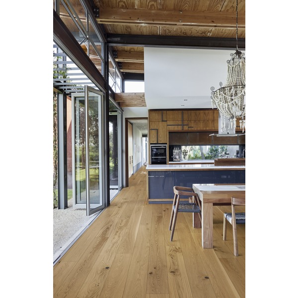 Plankegulv i ekte tre, hvor hver plankes toppsjikt består av kun ett stykke eik. Mikrofaset 4 sider, børstet og ultramatt lakk. Sees og føles som nysaget tre. Ultramatt overflate gir et gulv med minimal reflekser fra sol eller lampelys. Enkel, rask legging, egnet i kombinasjon med gulvvarme og norsk klima. 2,05 m2 pr. pakke.