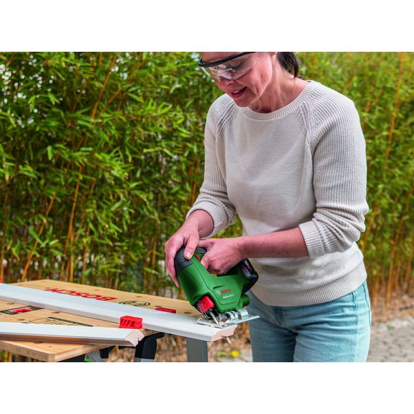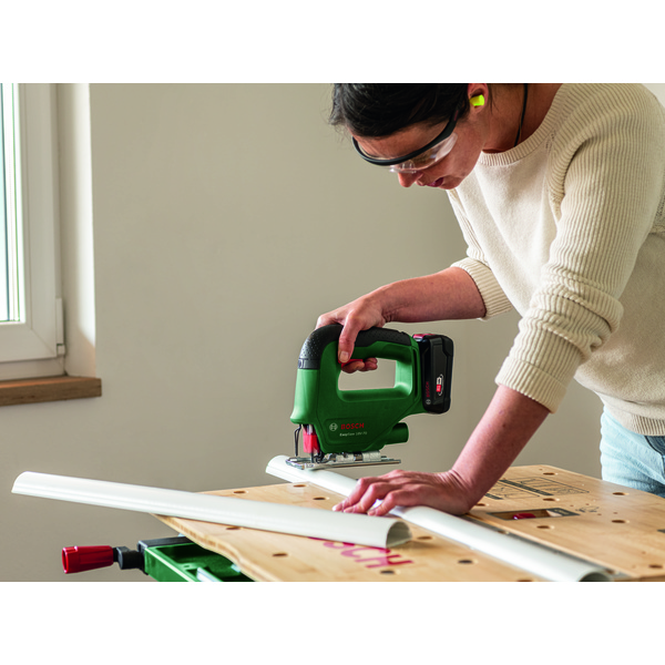 EasySaw 18V-70 er brukervennlig og pålitelig, og et godt valg for hobbysnekring og kreative prosjekter. Den lette stikksagen betjenes enkelt med bare én knapp, og takler rette og buede snitt inntil en dybde på 70 mm i tre og inntil 6 mm i metall. En hastighetsutløser, samt muligheten for å justere hastigheten, gir en myk start av verktøyet og god komfort. For å sikre nøyaktige kutt er sagelinjene synlige hele tiden, takket være en spesiell blåsefunksjon som blåser bort sagstøv. Sagbladet byttes enkelt med et innebygd SDS-system. Verktøyet hører med i POWER FOR ALL ALLIANCE: Ett batteri kan brukes på mange forskjellige verktøy av ulike merker.