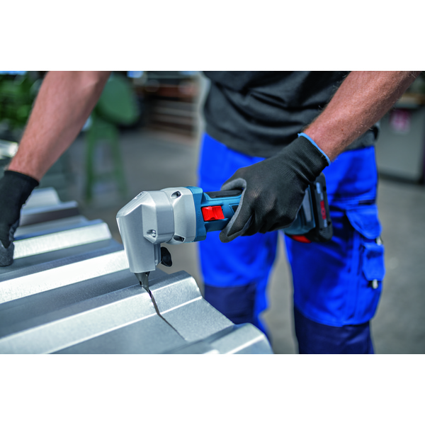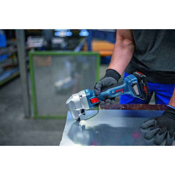 GNA 18V-16 E batteridrevet platesaks skjærer like kraftfullt som et 700-watts ledningsdrevet verktøy, takket være den effektive børsteløse motorteknologien. Den er dessuten perfekt balansert og enkel å håndtere takket være den lave vekten og en håndtaksstørrelse på bare 156 mm. Med et robust design av høy kvalitet, vedlikeholdsfrie komponenter og børsteløs motorkraft kombineres topp ytelse med svært lang verktøylevetid. Den kraftige platesaksen passer til skjæring av mange forskjellige stål- og aluminiumsplater, ventilasjonsrør og kanaler. Den kan brukes med alle Bosch Professional 18V-batterier og -ladere (medfølger ikke), og leveres i en pappeske.