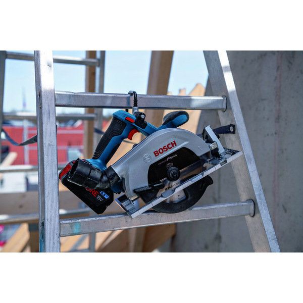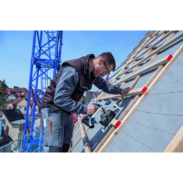 Den kompakte batteridrevne sirkelsagen GKS 18V 57-2 Professional – med sagbladet på høyre side – har en imponerende ytelse, takket være den kraftige børsteløse motoren. Sagbladet på 165 mm har en sagedybde på inntil 57 mm ved 90° kutt og er optimert for arbeid uten ledning. Sirkelsagen sørger dessuten for både rask saging og maksimal batteritid. I tillegg har den en støvsavsugskobling som kan dreies 360 grader og som kan brukes med Click&Clean System og med støvposer. Dette gir mulighet til svært effektivt støvavsug og sørger for økt beskyttelse for brukeren. GKS 18V 57-2 Professional er beregnet for saging av tre og trekompositt. Produktet leveres uten batteri og lader i en L-BOXX.