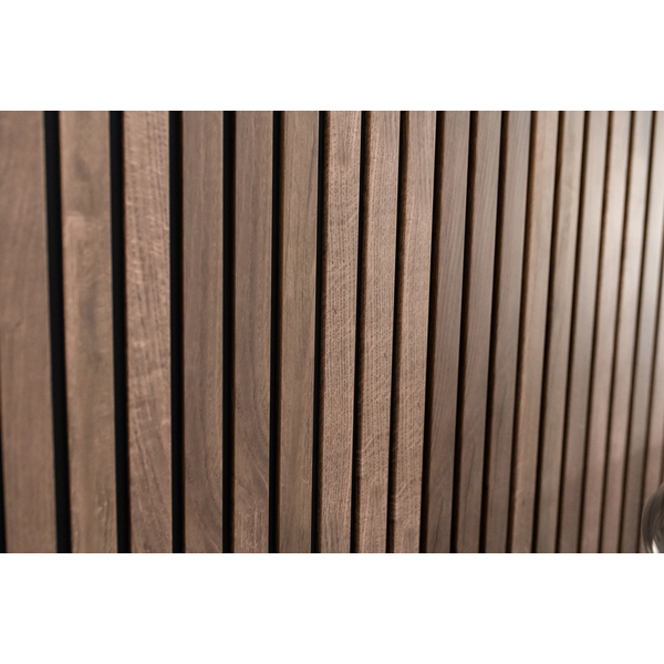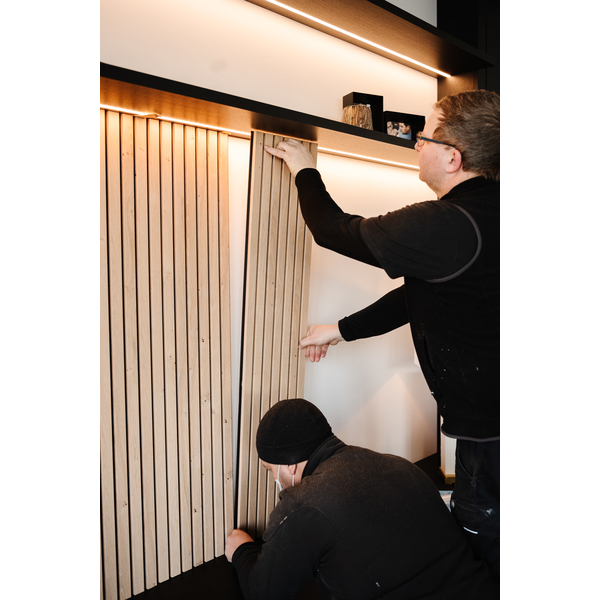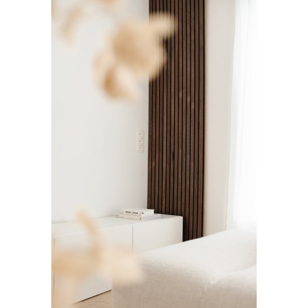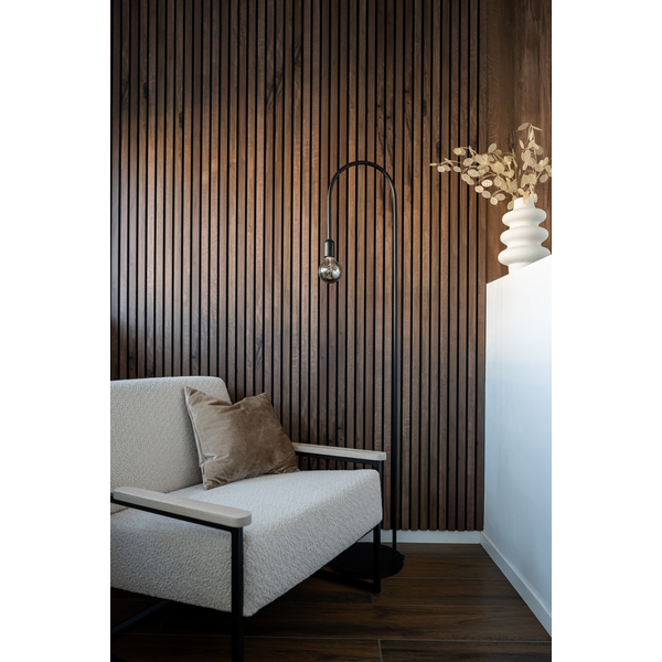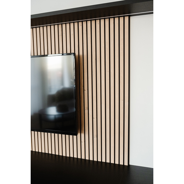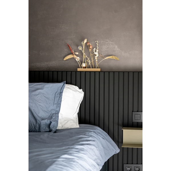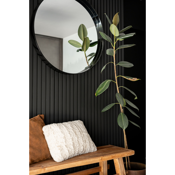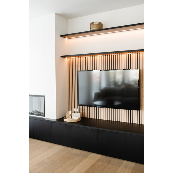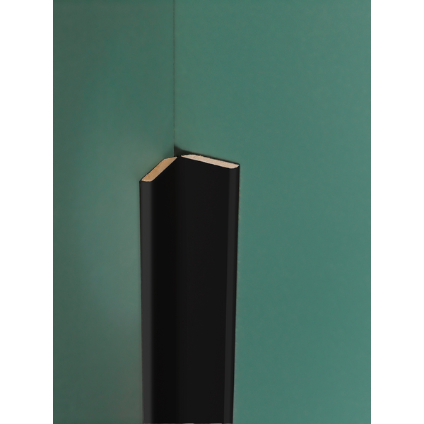 Flexilist 4x50x2700 MDF Black. Maestro Spilepanel for tørre rom består av strukturfolierte MDF-spiler på sort bakplate. 30cm panelbredde og not og fjær, betyr skjult stifting, samt enkel håndtering og montering. Strukturfolien er 100% lysekte. Fås i lengdene 2,4 og 2,77 m. Det er 7 spiler per 30cm panel, dekningsbredde 28,7 cm. Med avslutningslist får man en perfekt avslutning på veggen, eller til en innramming rundt f.eks sengegavl. Flexilisten brukes ved overganger og vinkler