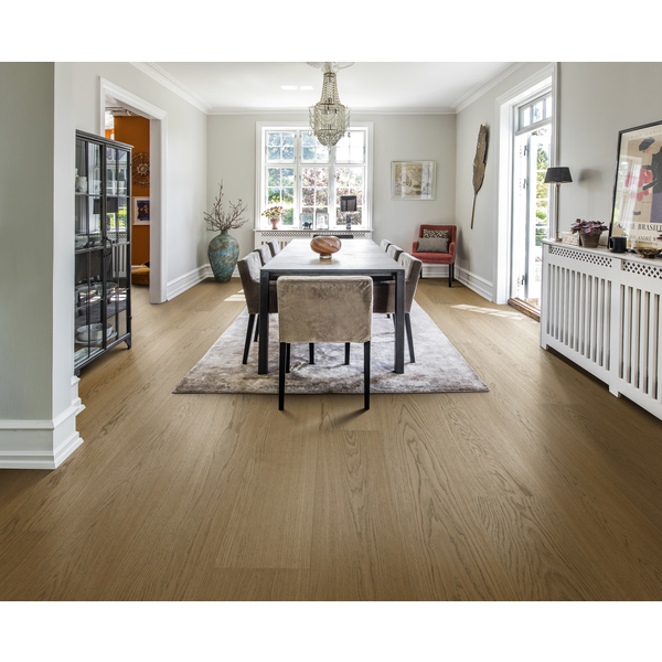Ekered har en brun fargetone og en sortering som gir en ren og harmonisk følelse. Bjelins herdede tregulv er tre ganger mer slagfast enn tradisjonell parkett. Disse gulvene passer til alle deler av hjemmet. Et ekte tregulv produsert på en klimasmart måte, til en rimelig pris.