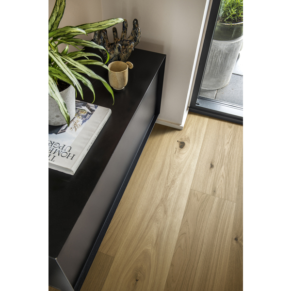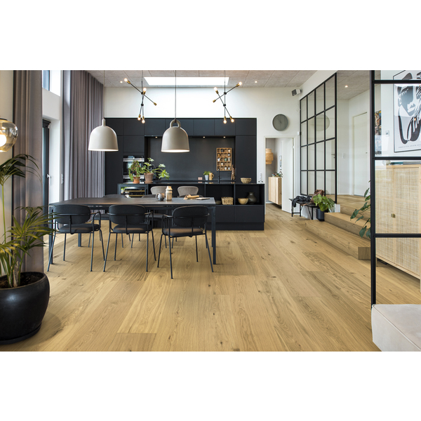 Eket har en naturlig fargetone og en sortering som gir en autentisk trefølelse. Bjelins herdede tregulv er tre ganger mer slagfast enn tradisjonell parkett. Disse gulvene passer til alle deler av hjemmet. Et ekte tregulv produsert på en klimasmart måte, til en rimelig pris.