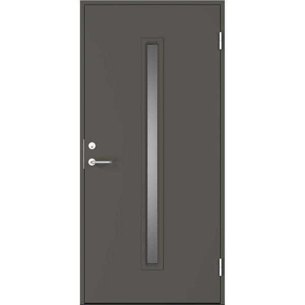 Swedoor C-7010 ytterdørsett 9×21 Venstre malt mørk grå NCS S7000-N med klart glass. Dette er et dør i vår clever-line+ serie som har en lett konstuksjon med kjerne av EPS og er CE merket. Døren er hengt i en 105mm karm med kompositt terskel og har montert framefast hylser, skruer medfølger. Dørsettet kan fås i hvilken som helst godkjent NCS farge og hvis ønskelig ferdigmontert digitalt lås.