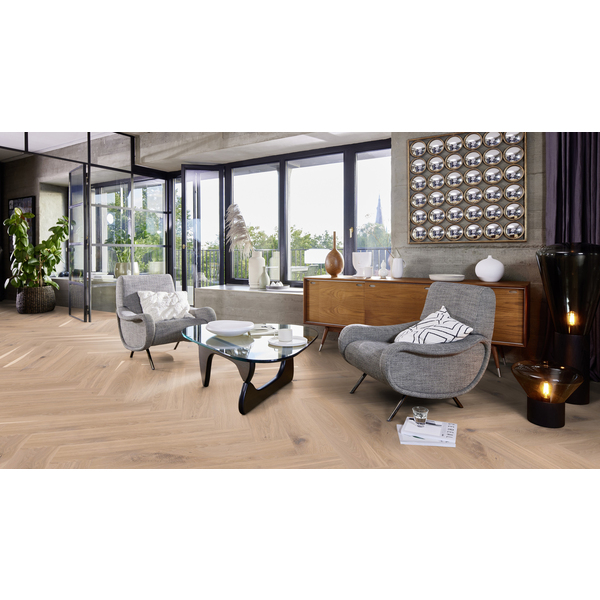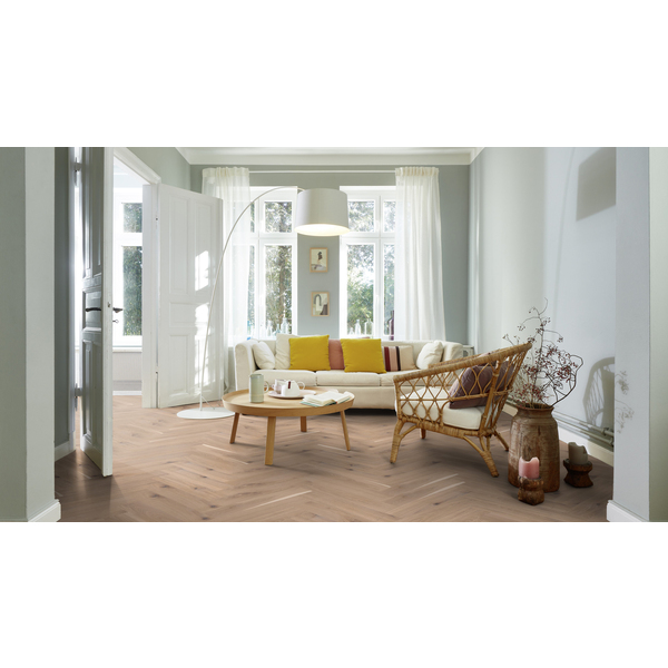 Eik Vivo børstet hvit 138mm fiskeben click har en behagelig matt og lys fargetone som skaper en jordnær og typisk skandinavisk stemning. Et røft fargespill, store sparklede kvist og sprekker. Fiskebensmønster gjør at rommet ditt skiller seg ut. Det tidløse gulvmønsteret kan skape en klassisk atmosfære eller være er moderne element, alt etter din stil. Børsting og naturolje fremhever den naturlige overflaten og trestrukturen og gjør gulvet godt og behagelig å gå på