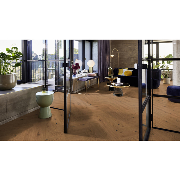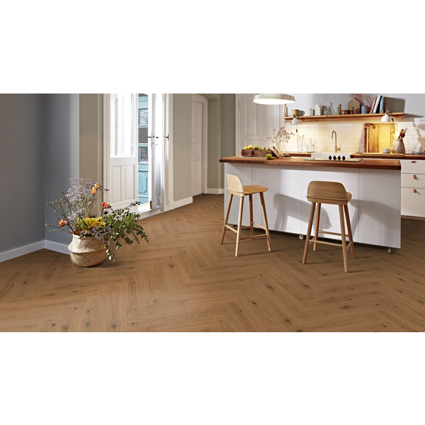 Eik Honey er et varmt, honningfarget gulv. Den varme brunfargen passer perfekt til klassisk interiør, og gir rommet et lunt og koselig uttrykk. Et røft fargespill, store sparklede kvist og sprekker. Fiskebensmønster gjør at rommet ditt skiller seg ut. Det tidløse gulvmønsteret kan skape en klassisk atmosfære eller være er moderne element, alt etter din stil. Børsting og naturolje fremhever den naturlige overflaten og trestrukturen og gjør gulvet godt og behagelig å gå på.