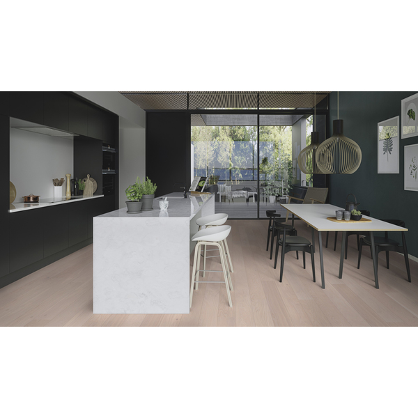 Eik Pearl 181mm plank, gulvet skinner nesten som perlemor. Den hvite pigmenteringen får spillet i treverket til å leve i takt med skiftende lys. Et røft fargespill, inneholder kvist. Plankene på 181 mm understreker perspektivet i rommet og fremhever den naturlige trefølelsen. Parketten er behandlet med naturolje. Oljen inneholder bare naturlige ingredienser som oljer fra solsikke, tistel og soyabønne og naturlig voks (karnauba og candelilla) og gir svært god beskyttelse mot væsker, samt forbedret UV-stabilitet. For å forbedre slitestyrken anbefaler vi ett strøk med Boen Natural Oil før gulvet tas i bruk, deretter Boen Freshen Up for vedlikehold av mer trafikkerte områder. Husk matchende gulvlister for å skape helhet og et eksklusivt utseende. 5G Click system. Velegnet for gulvvarme.