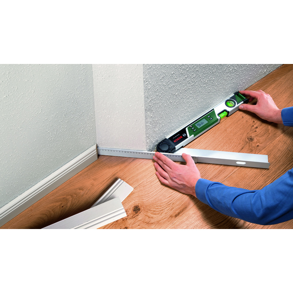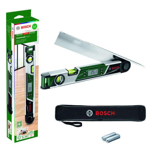 UniversalAngle sørger for rask og enkel måling, beregning og overføring av vinkler. Den har et praktisk skyvbart ben som forlenges til opptil 35 cm for måling av supplementærvinkler på vanskelig tilgjengelige steder, slik at den er perfekt til gulvlegging og flislegging. Med integrerte målefunksjoner er det komfortabelt å beregne enkel eller dobbel gjæring, slik at det blir enkelt å stille inn kapp- og gjærsager nøyaktig – perfekt ved montering av gulv- og taklister. Verktøyet leveres med batterier, benforlenger og oppbevaringsveske i en pappeske, og inngår i Bosch sitt nyutviklede bærekraftprosjekt.