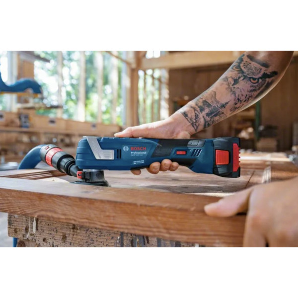 Oscillerende multiverktøy er problemløsere med nesten 100 tilbehør. Ulike oppgaver krever ulike blad, og det kan være tidkrevende å bytte dem. Vi utviklet GOP 18V-34 Professional med børsteløs motor og vårt patenterte Snap-In-låsesystem, slik at du kan bytte bladene på få sekunder uten behov for ekstra verktøy. Sterke vibrasjoner på oscillerende verktøy er dessuten svært ubehagelig: vår Vibration Control reduserer vibrasjoner betydelig (50% mindre enn forgjengeren) og sørger for at du kan jobbe jevnt og med mindre belastning. Takket være det smale håndtaket (Ø180 mm) har du full kontroll over verktøyet og maksimal komfort under arbeidet. Verktyet er perfekt til skjæring, pussing og sliping av tre, og til å skjære PVC/metall eller fjerne fuger mellom fliser. Leveres uten batteri i pappeske.