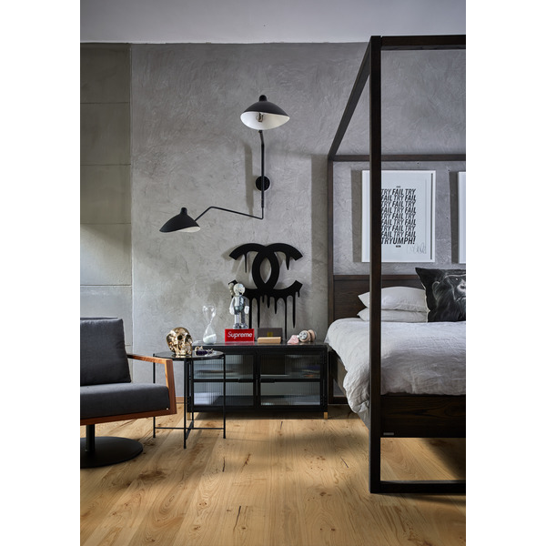 Eik Rochford er et 1-stavs gedigent plankegulv i naturell eik, fasede kanter, med børstet overflate og matt lakk gir rommet et markant utrykk. Hver planke er 18,7 cm bred og 227 cm lang. Med Woodloc5S kan gulvet enkelt legges i store areal opp til 25 meter i bredden og det er tilpasset relativ luftfuktighet (RF) 20 -60 %. Tidløst, for tørre rom og kan kombineres med gulvvarme.