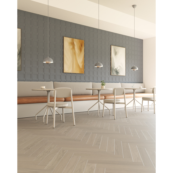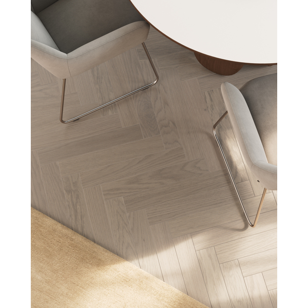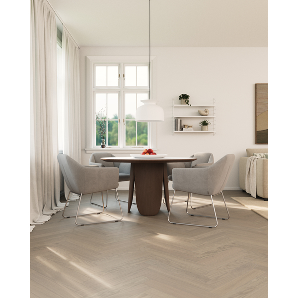 Kila er et vakkert Woodura Fiskeben 2.0-gulv som komplimenterer myke nyanser. Fargen Earth Grey er innbegrepet av rolig eleganse, og sammen med Select-sorteringen gir dette gulvet en harmonisk atmosfære.
